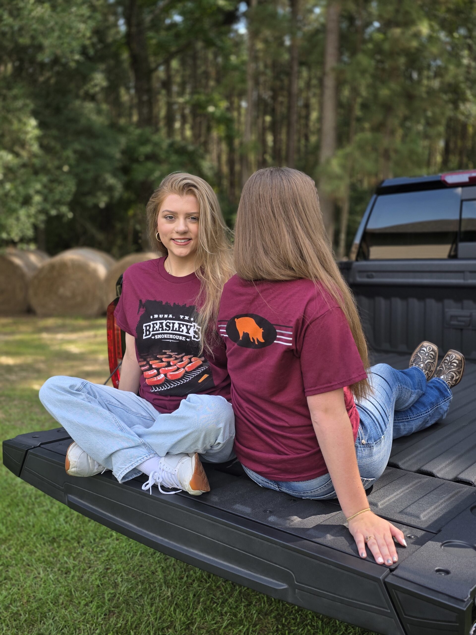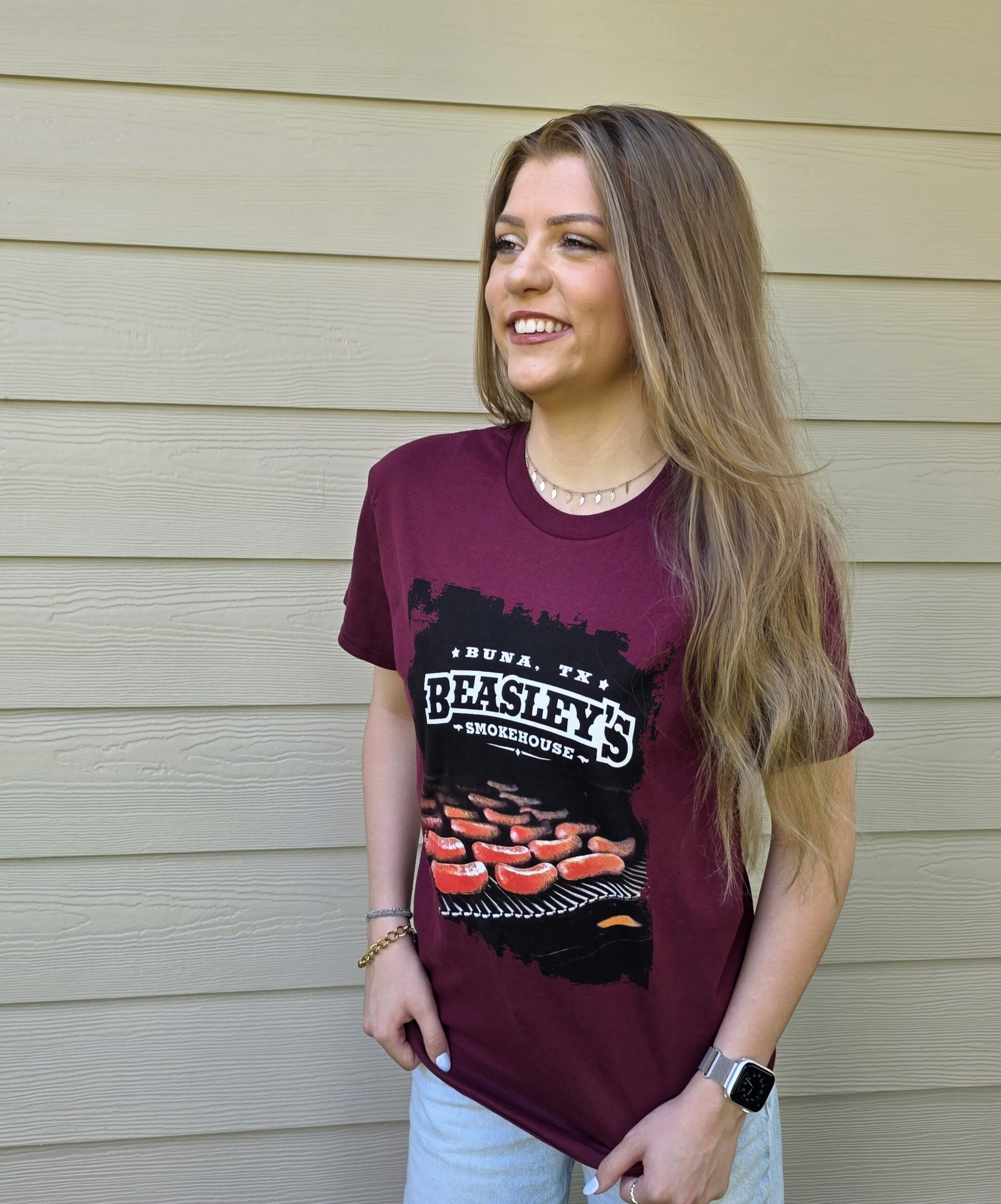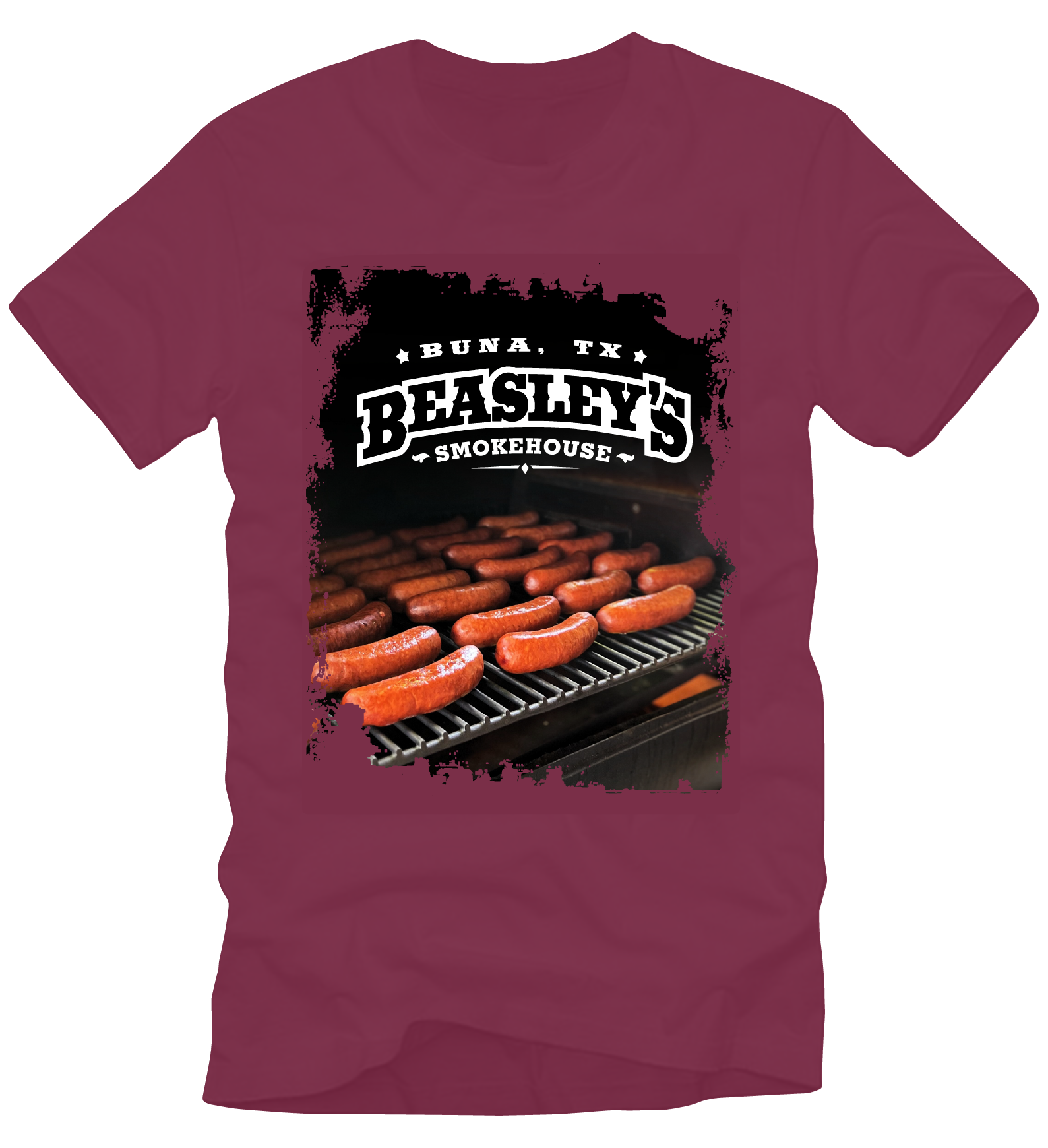 Fire up your style with the Maroon Beasley’s Smokin’ Grill Tee — featuring a full-color photo of Beasley’s famous smoked sausage right on the front. This shirt captures the essence of Buna, Texas barbecue pride, with a bold pig emblem across the back that reminds everyone where real smokehouse flavor comes from.